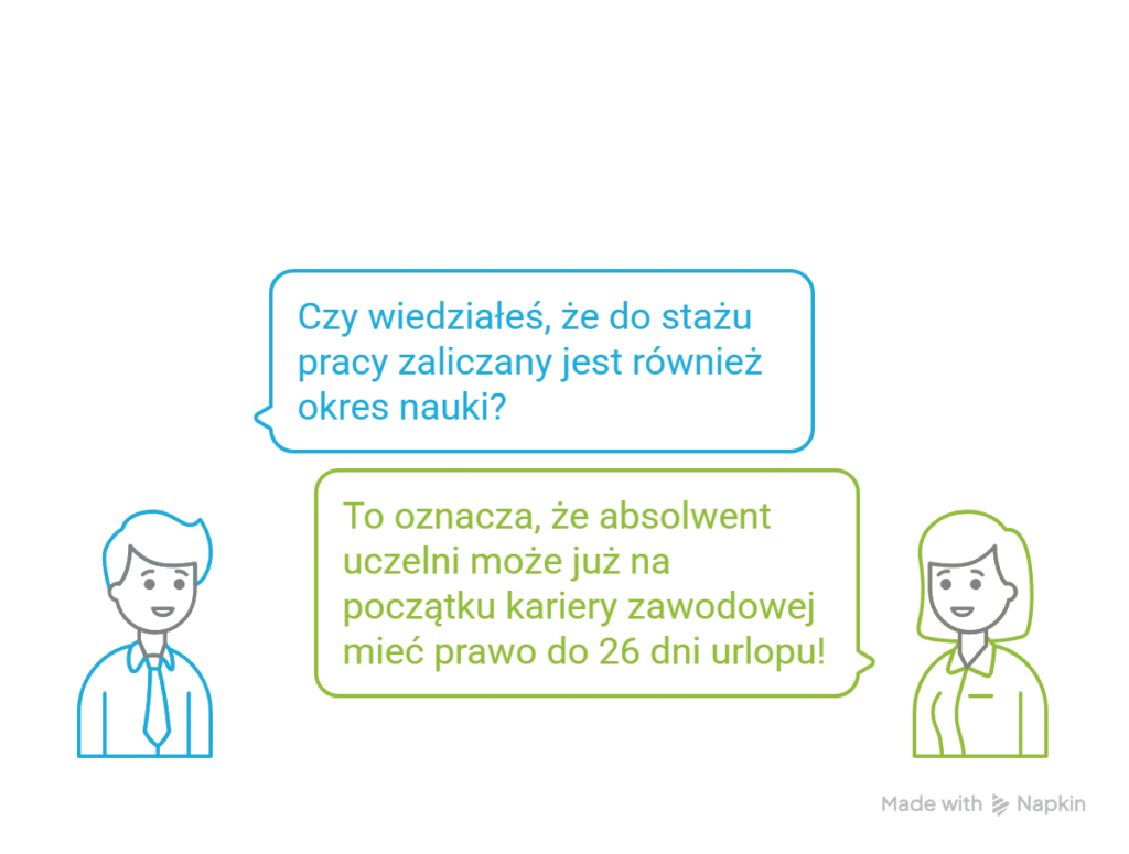 Czy wiedziałeś, że do stażu pracy zaliczany jest również okres nauki? To oznacza, że absolwent uczelni może już na początku kariery zawodowej mieć prawo do 26 dni urlopu!